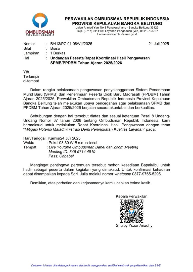 DISDIKBUD Belitung Mengikuti Rakor Hasil Pengawasan SPMB/PPDBM Oleh OBBUDSMAN RI